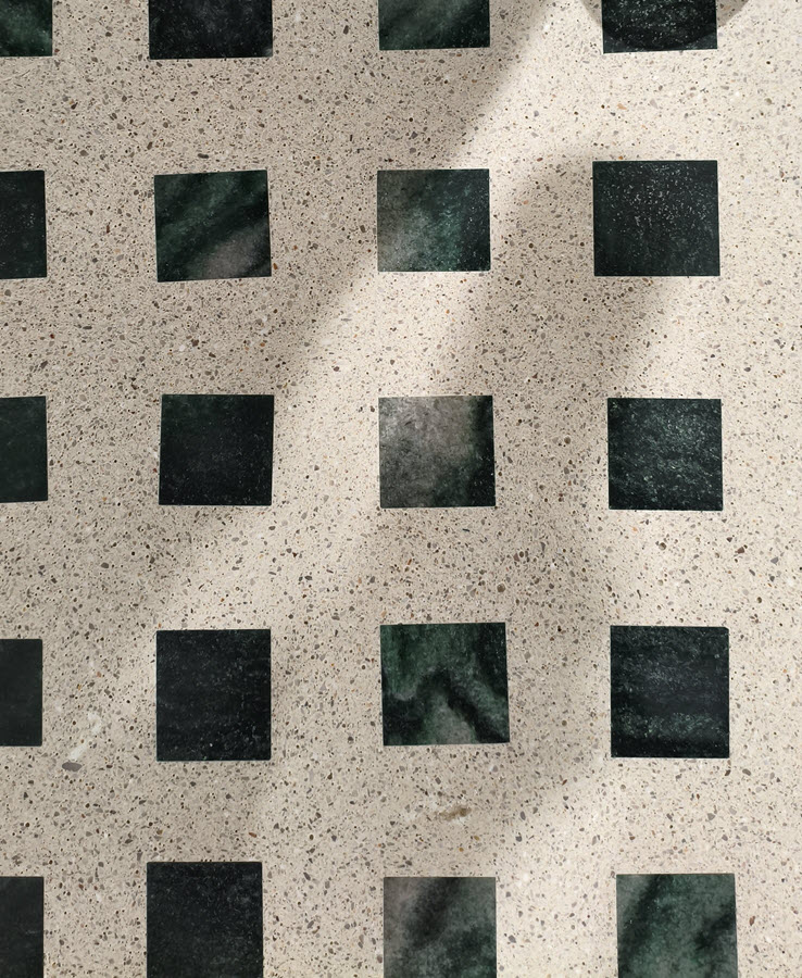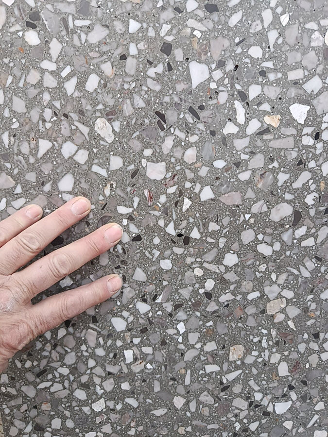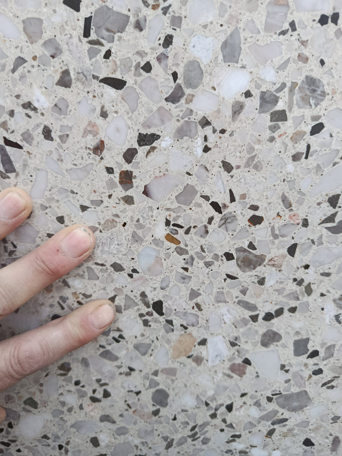 Obloga vrta, letna kuhnija ter betonski stebri nadstreška, vse iz belega brušenega betona....